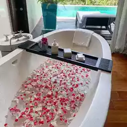 There is 1 bedroom, but for the private pool of the villa, I must say that it is very large, just like the resort itself, with a common area and a spacious area, giving a sense of proportion and a good social distance.