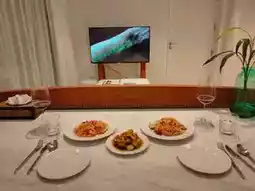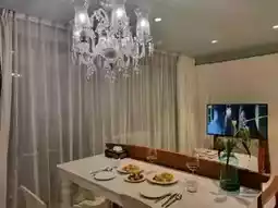 Next to the living area, there is a dining table for 2. There is a large lamp above the dining table. Next to the dining table, there is a sofa for watching TV. On the right-hand side of the living area, there is a king-sized bed. On the bed, there are 4 pillows. On the side of the bed, there is a lamp and enough power outlets to charge. There will be sheer curtains to separate the bedroom and living area. There will be 2 air conditioners in the room, one in the living area and one in the bedroom.