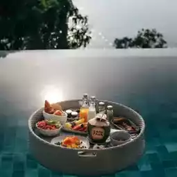 Fruits with snacks both savory and sweet, refilled every day. We started checking in at 10:00 AM, late check-out no later than 2:00 PM. Very very very good. There are non-motorized water activities, 10% discount on food and drinks