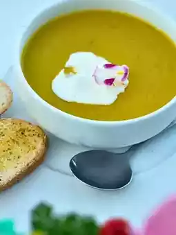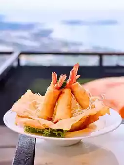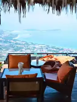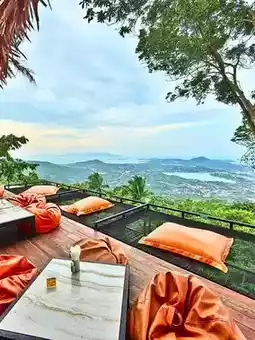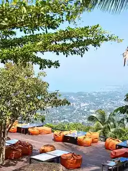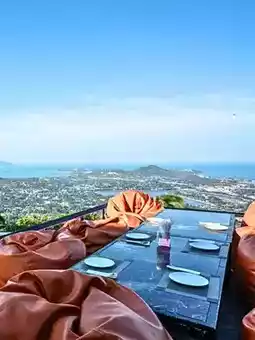 Today, we will take you to enjoy a delicious meal at a restaurant on Koh Samui, which is known as the highest restaurant on Koh Samui. The main dishes cost hundreds of baht but the view is worth millions. This is The Roof Samui. The view is beautiful and the food is delicious. However, to get to the restaurant, we recommend using the restaurant's shuttle service because the route is quite steep, narrow, and has many curves. It may require expertise and a good driving skill. We also recommend that you book a table in advance by choosing a table on the edge so that you can see the 180-degree view of Koh Samui. Let's see how beautiful it is.