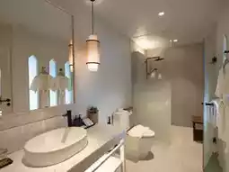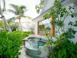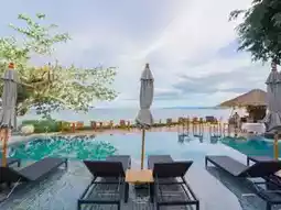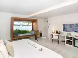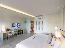 This is a beachfront accommodation on Lamai Beach. The surrounding atmosphere is shady with greenery, quiet, suitable for relaxation. The rooms are available in both hillside zones and beachfront villas. The room that the two of us stayed in today was the Premier Beachfront with Plunge Pool. It is a villa with a private plunge pool, decorated in clean white tones, and comes with complete facilities. There are large windows that can see the sea view. It's very chill.