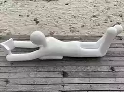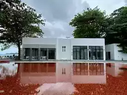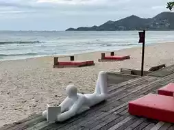 🍀 All of these, I dare say, are true. What kind of resort... has such great details on the beach, whether it's the red swimming pool, the minimalist restaurant, the dining beds on the beach, or the deck decorated with grass, contrasting the white of the building and the red of the swimming pool, or the cool statues in various interesting poses in all the common areas.