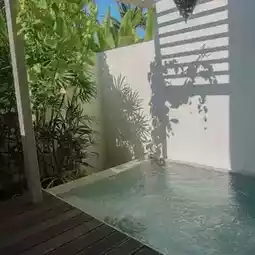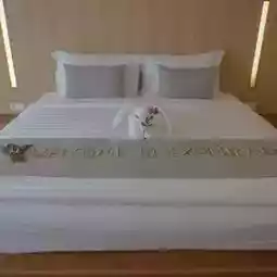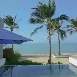 The hotel offers various types of rooms, including pool villas with private pools and deluxe rooms with private spa baths. The decor style here is Modern Luxury, with complete amenities that are simple yet luxurious. The atmosphere is excellent, surrounded by trees, and very quiet, perfect for those who love privacy. The resort features a private beach, a large communal swimming pool, and a pool bar where you can order drinks to enjoy while relaxing. In the evening, the sunset lighting is perfect, with photo spots and seating areas to enjoy the beautiful sea view and chill atmosphere. It's a must-try experience.