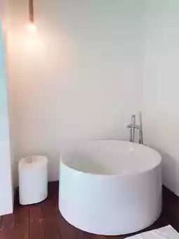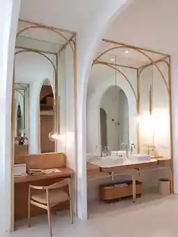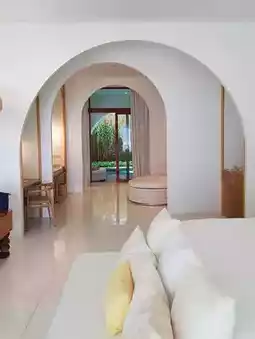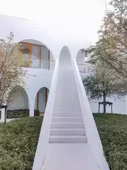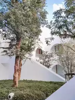 The white color of the hotel contrasts with the green of the garden, making you feel relaxed