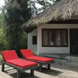 • Bright orange tables and bean bags on the wooden balcony give a chic, chill Four Seasons feel in the middle of the jungle, without any railings to block the view. ()