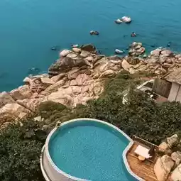 Cliff-top resort with panoramic ocean views. Villas with plunge pools, spa, rooftop bar, private beach cove