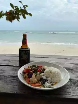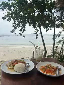 Very good restaurant located directly on the beach. Has a swing rope, swings, tables, sunbeds and stools. Nice place to bring kids and enjoy the beach. I ordered spaghetti carbonara (200baht) and while it was good, it was not exceptional. Their food prices are above average and beers are 60-70baht. It looks like they have limited staffing so around lunch and dinner time it can be long to receive your meal. I included the menu in the pictures.