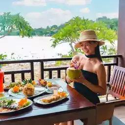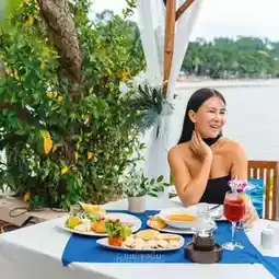 When we arrived, we ordered a 𝘼𝙛𝙩𝙚𝙧𝙣𝙤𝙤𝙣 𝙏𝙚𝙖 𝙏𝙚𝙖 𝙏𝙚𝙖. They served delicious Thai desserts. Then, after relaxing here, you have to try their food. I have to say it's absolutely delicious. Breakfast is a classic, and dinner🍴 features both Thai and European dishes. I recommend the pineapple fried rice with shrimp, fried soft-shell crab with garlic, steamed sea bass with lime, and fried spring rolls. The flavors are absolutely delicious!