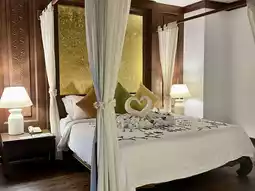 The pool villa comes with a private pool and a very spacious area. It is well-divided into sections, including a bedroom, living room, dressing room, and bathroom. There are two TVs for relaxing, watching Netflix, and enjoying the pool. Plus, they provide a welcome fruit basket and full-service hospitality.