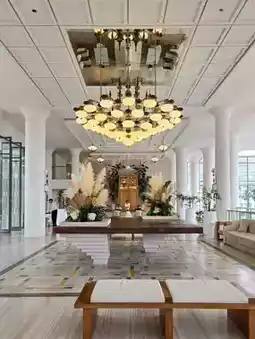 The predominant white color is enriched with depth through large furniture pieces, flowers, and ceiling chandeliers. The columns, walls, and tables are varied in design, making it a perfect place to relax and admire. Modern Thai floral patterns are incorporated into the details, such as decorative lights, tables, and vases, showcasing clever craftsmanship.