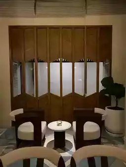 The room isn’t spacious, at just 48 sqm, and lacks a bathtub. However, the decor is stunning, featuring rose gold collections in metallic elements like lights, handles, wall plaques, and even small details like door stoppers and paper towel holders—all in rose gold. The geometric patterns are cleverly reused in various items, showcasing perfect attention to detail.