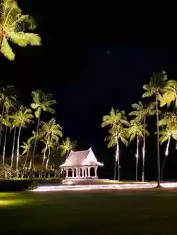 Clean, beautifully designed, spacious, and airy, with natural light blending harmoniously from the sky, water surfaces, and grassy fields. Tall circular columns reaching the sky create a majestic atmosphere reminiscent of a cathedral. Nearby, you can see a Thai pavilion and turquoise sea.