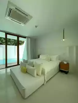 The spacious rooms, primarily villas and suites with private pools, offer a beautiful contrast between the pure white interior and the turquoise sea, creating a stay that feels like a scene from a movie.