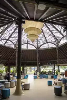 The outdoor waiting area is even more enchanting. Swings, bean bag chairs, large lawns... every corner seems to invite you to pause. My favorite spot is sitting on the sofa under a tree, ordering a cold drink, and watching planes slowly take off and land above the coconut trees. At that moment, waiting is no longer a torment but another enjoyable part of the journey.