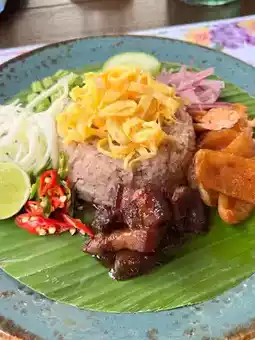 - Lanan Set Breakfast: Northern Thai sausage, grilled pork skewers, and Nam Prik Noom (Northern Thai chili dip).