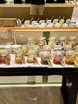 · Live Station: There's a live egg station where you can make your own to-order eggs, a pasta station, and a congee bar where you can choose your own side dishes.