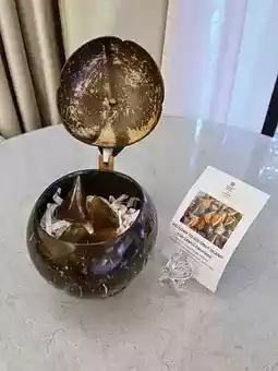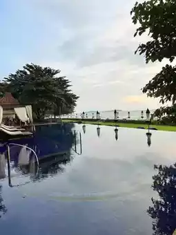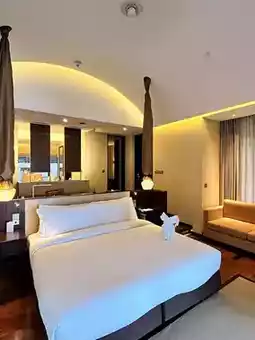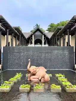 Upon arrival, the staff at the front desk greeted us with a traditional water pouring ceremony, pouring water over our hands as a welcome drink. They also served a welcome drink of butterfly pea and coconut water, along with a floating krathong in front of the hotel.