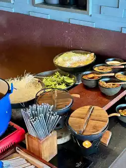 Breakfast is plentiful, offering local Thai dishes like grilled chicken, grilled pork, green curry, and the richly flavored braised eggs, as well as international dishes like eggs Benedict, bacon, pancakes, and cereal. There's also a fresh salad bar with a variety of dressings. Every dish is beautifully presented and made with five-star ingredients, truly befitting a luxurious beachfront resort on Koh Samui.