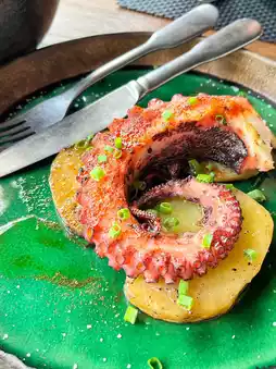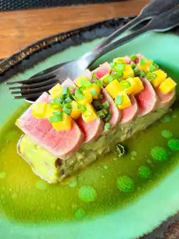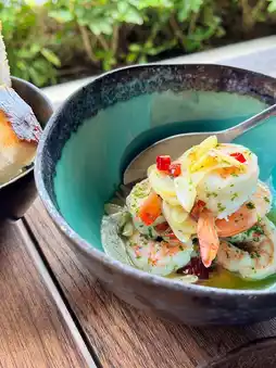 We recommend starting your meal with the ceviche, a delightful dish featuring diced sea bass marinated in a sweet and sour passion fruit sauce. Another must-try is the black paella, served in a large pan for multiple people. The rice is cooked perfectly and the flavors of the squid stock are infused with the juicy texture of the squid. It's a delicious experience.