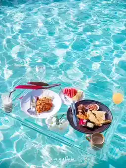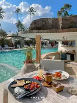 Breakfast has 2 sets to choose from: Pad Thai ๐ and English Breakfast ๐ณ. The taste is good. The Pad Thai is rich and delicious. I secretly saw that there is a Floating Breakfast. It's a clear tray. Very chic, super cute. โจ Girls who like taking pictures, come here. You won't be disappointed. The pool area is really great. The light is beautiful all the time.