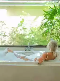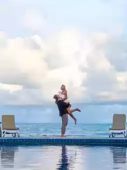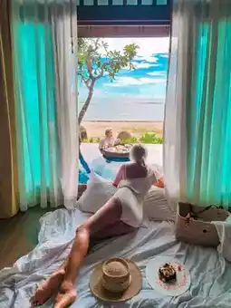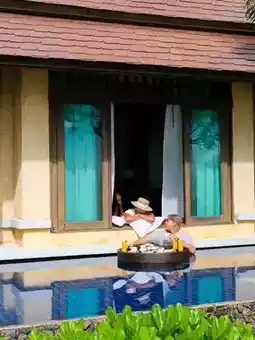 The house that Tong stayed in was the Beachfront pool villa suite 🤍 with a full Floating breakfast. It was beautiful and filling. ☕ Let's continue to our room. There is 1 bedroom, 1 bathroom, a very large bathtub, fragrant soap and shampoo, 1 large living room, and 1 pool. All of these are sea views. We can open the curtains and see the sea. It feels very good. And in the evening when Tong stayed, the sky was very beautiful. You can see from the picture. At night, I slept and watched the moon. It was so romantic. 😊