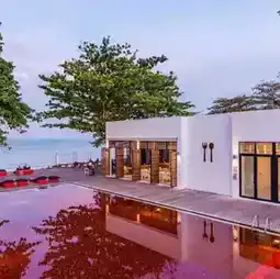 The Library Hotel on Koh Samui is located on Chaweng Beach. This five-star luxury hotel has a beautiful and stylish design under the concept of the hotel's name, which means library. The accommodation has a nice and shady atmosphere. There is a private beach, quiet. Here, there are many types of rooms, from normal rooms to pool villas. The rooms are modern in white, red, and black. The rooms are clean and comfortable, with various amenities. There is a large library, fitness center, spa, and windsurfing. The red swimming pool is the highlight of this place. It has become a symbol of this place. Anyone who stays here must come to take a picture and check in. There is also a beach bar in the evening with a DJ playing music. The hotel is beautiful and the service is good. If you come to Koh Samui, I recommend that you stay at The Library Hotel. You will definitely be impressed. #Accommodation by the sea