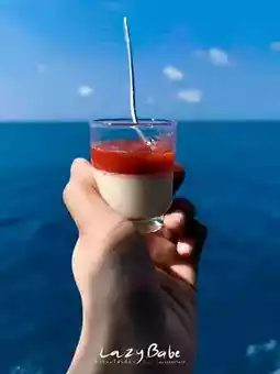 This time, they served panna cotta. Wow! 😋 It was so delicious. I wanted to ask for several more cups. 55555 At this point, I intended not to go down again. But Phi Wut insisted on going to see the beauty. Phi Wut brought a floating buoy for us to hold on to so that we wouldn't get tired. In the end, Phi Wut was so tired that his eyes were wide open because so many people came to hold on to it. 5555