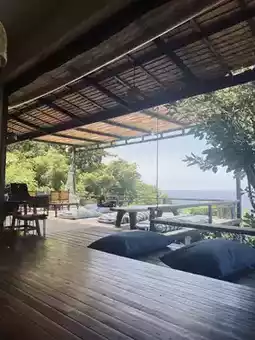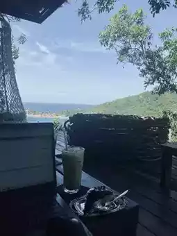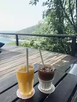 The shop is decorated in a simple, friendly style, like hanging out at a friend's house by the sea. There are both indoor and outdoor areas with wooden and stone tables. The wind blows cool all day long. Parking is also convenient. Those who rent a motorcycle to travel around the island can easily stop by.