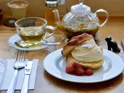 The kurmido cake tastes like a muffin and is topped with baked apples and cream.🍎