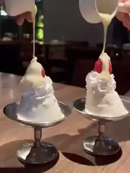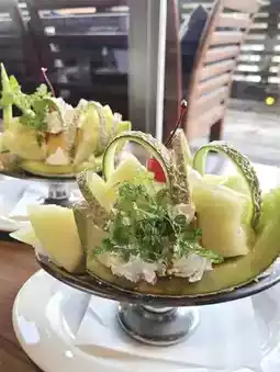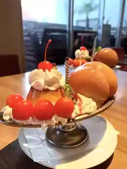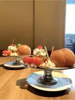 A firm pudding made with Ajiho eggs with whole peaches and cherries 🍒