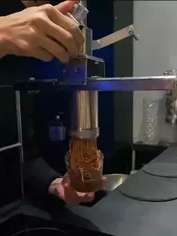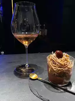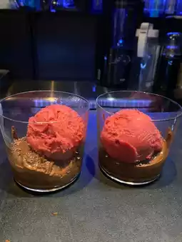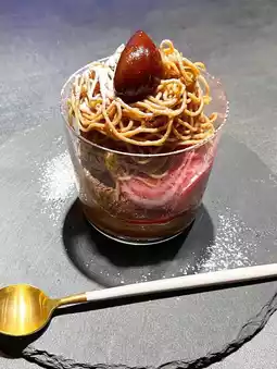 From the bottom up, it's chocolate cream, raspberry gelato, and a chestnut on top of the Mont Blanc cream, squeezed right before your eyes.