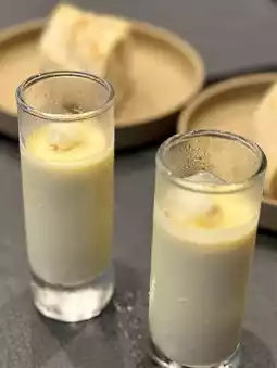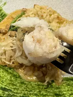 Creamy potage and sticky sweet shrimp tartare topped with salmon roe, caviar, and sea urchin,