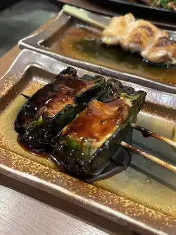 ✤Yakitori liver, stuffed green peppers, pork belly, king oyster mushroom skewers