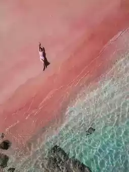 The pink beach, famous on Instagram, is known for its pink sand, which is due to the presence of red coral fragments. Under sunlight, the beach shines with a pink glow, making it incredibly beautiful. To capture the best photos, a drone is recommended.