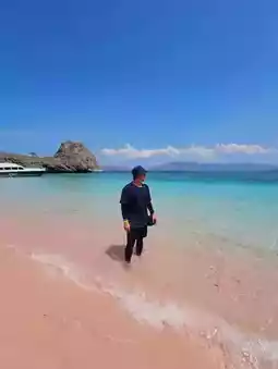 Pink Beach is actually located on Padar Island too, just on the other side—you’ll need to hop on a boat to get there. And the view? Oh my God, it’s insanely beautiful! With clear turquoise waters and soft pink sand, it felt like a completely different world compared to the beaches back home. Add in the blazing sun and bright blue skies, and you’ve got the perfect combo for that one photo guaranteed to make your friends stuck at work super jealous.