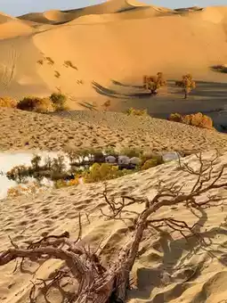 The moment I climbed to the highest point of the desert, my eyes went wide—the deep blue lake nestled among the golden sea of sand, the poplars on the shore reflecting the water into gold, every leaf glowing. This scene doesn’t need any filters!