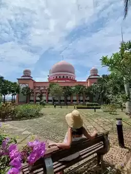 The salmon pink mosque towering on a hill is one of Kota Kinabalu's famous tourist spots.