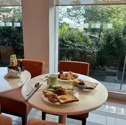 The area around the breakfast restaurant is well-landscaped,