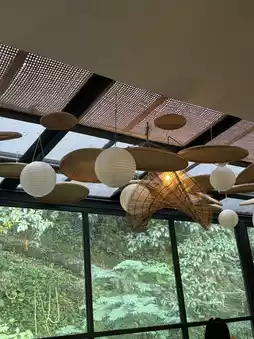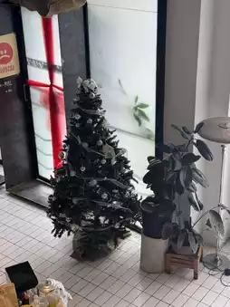 It was a cafe that had a Christmas tree and many beautiful sculptures on the ceiling