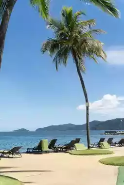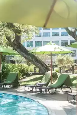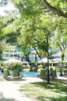It's not particularly large, but there are a fair number of deck chairs and some areas shaded by green trees, creating an overall relaxing atmosphere.