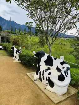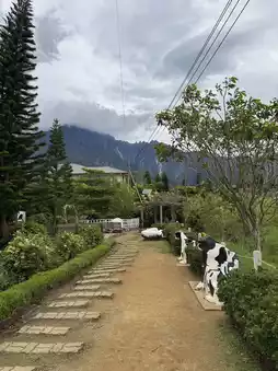 Walking around Desa Dairy Farm feels like stepping into a countryside film. Tall pine trees, wooden fences, open meadows, and majestic Mount Kinabalu peeking through the clouds—every path here feels peaceful and poetic.