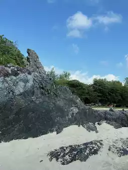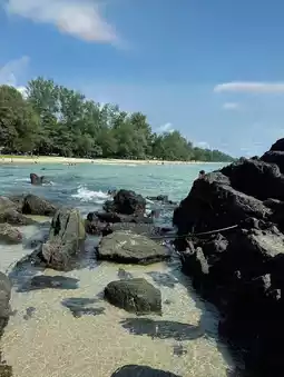 I spent a leisurely afternoon here, exploring tide pools at low tide, swimming in the gently lapping waters, and photographing the iconic sail‑shaped rock formations steadfast on the shoreline. The beach’s coral‑rich reefs lie just off the coast, adding a hidden depth for snorkelers. While strolling, I noticed a few local stalls selling snacks and drinks, and families picnicking under the trees—low‑key but charming, with a distinctly Malaysian coastal vibe.