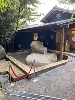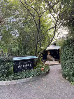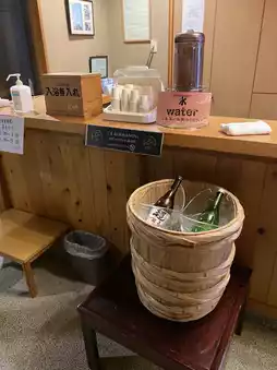 There are foot baths, a 'Hitoyasumi' café, and open-air baths surrounded by greenery. The Hitoyasumi café offers free alcohol at night as a post-bath treat.