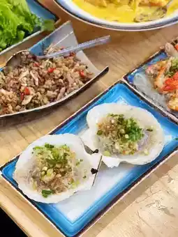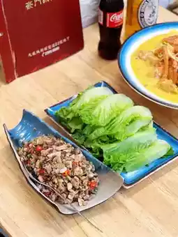 An improved version of Thai lettuce wrap, featuring stir-fried minced pork mixed with sweet and crunchy razor clams, crispy water chestnuts, smooth mushrooms, and onions. The tangy and spicy flavor is very appetizing when wrapped in refreshing lettuce.