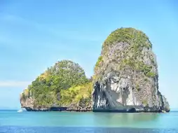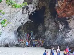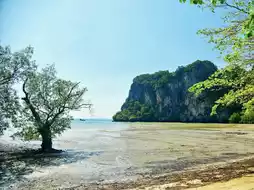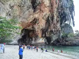 Railay Beach is a beach that many people say must be an island. But in fact, Railay is not an island. It is a beach that is close to Ao Nang. It is very easy to travel to. You can take a long-tail boat back and forth. Or you can stay there. There are hotels. During the peak tourist season, there will be only foreigners staying on this island. The view is very beautiful. It is full of large cliffs surrounding this beach.