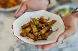 - Steamed Tiny Tofu, we like this a lot. The yellow tofu is steamed until soft, easy to eat, and sweet.