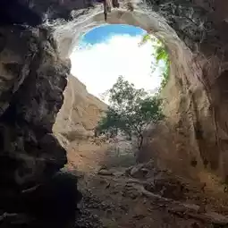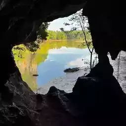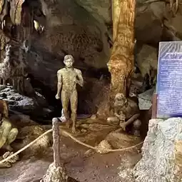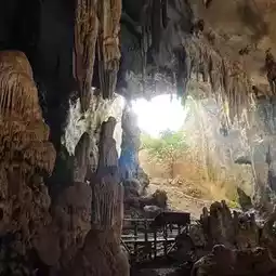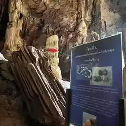 Krabi is not only good for the beautiful sea. Today, we took a long-tailed boat to visit the caves to find ancient humans at Khao Khanap Nam, the symbol of Krabi Province. We took a boat from Chao Fah Pier in the city to the mountain, which took about 15 minutes. In addition to taking a boat to see the mountain and the lush mangrove forest, we can also walk up to visit the cave. Inside the cave, there are beautiful stalactites and stalagmites, and ancient human skeletons. The cave is not very deep. The cave is not very dark because there are chimneys that let light in and the sky looks out. This spot is very beautiful.