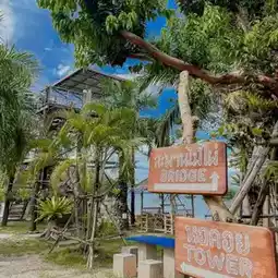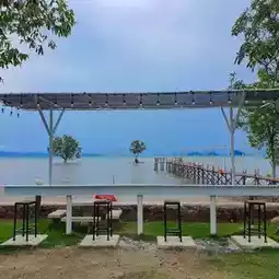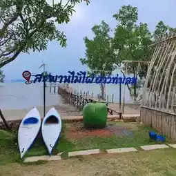 A bamboo bridge cafe that extends into the sea. There are trees in the shape of a heart. Beautiful view, good atmosphere, suitable for people who like to take pictures. There are food and drinks available. The view is very beautiful. The atmosphere is good. Suitable for those who like to take pictures like us. No matter which angle you take, the view is beautiful. Especially when the sun sets, it will be very romantic. And here there is also a cafe for us to sit and chill. The shop is open every day. The entrance fee is 20 baht per person, but it can be used as a drink and food.