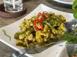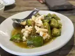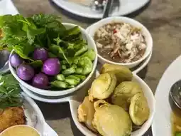 The shop is open-air. The tables are wooden tables. The area is quite spacious. This is the second time I've been to this shop because I'm impressed with the taste of the food. Recommended menu: Mango chili paste is very delicious. The shrimp paste has a well-rounded taste. It's sour and sweet. Eat it with fried eggplant. It's so delicious that you can finish the whole plate. There's also stir-fried free-range chicken with chili paste. It has a fragrant aroma of spices. It's well-rounded and a little spicy. This dish is very good. Fried shrimp cakes 🤤 are so delicious that you want to eat them again.