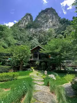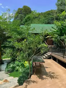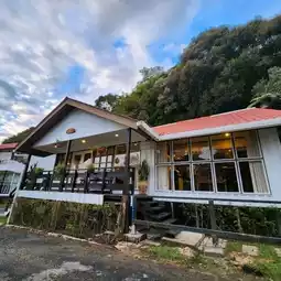 🌲 Overall atmosphere: It is a large house surrounded by large trees and a high mountain in the back. Providing shade amidst nature